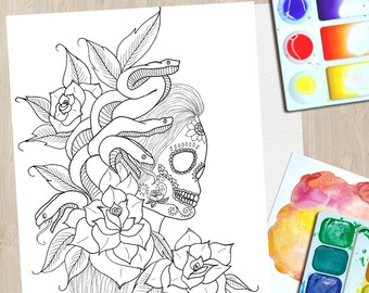Color with tattoo containing a skull, a snake and beautiful roses with leaves.